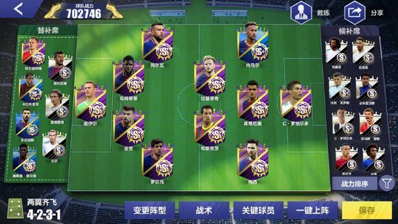 其次分享一下战术,我认为巴萨套可以采用的几种常用阵型。第一,边锋433。第二,4231两翼齐飞。第三,4321圣诞树。第四,4312。这几种战术的采用我是比较灵活的根据对手去选择,如果对手边后卫抢断比较厉害,我就会选择中路进攻。我和我们区的一个V12切磋了无数次,在我采用边锋进攻的时候,我胜率不到40%。但是在我变成中路进攻的时候,虽然战力低了7W,但是我最多连着赢了10场。所以我认为,根据不同的需要选择不同阵型才是王道,没有一种阵型可以克制所有的,所以在你面对天梯和世界杯不同的对手,你可以采用边或中不同的阵型。