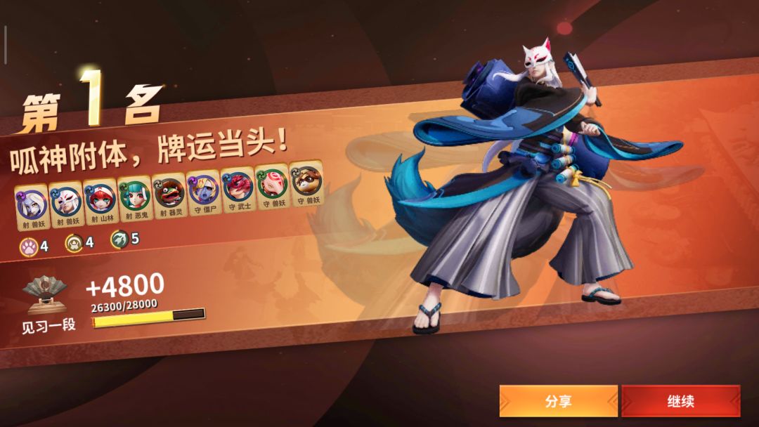 最终追求的buff当然是6射4兽妖,但考虑到实际情况:6射的橙卡御馔津出现几率略低,4射4兽妖即可,强度也不错,还可以搭配守buff过渡