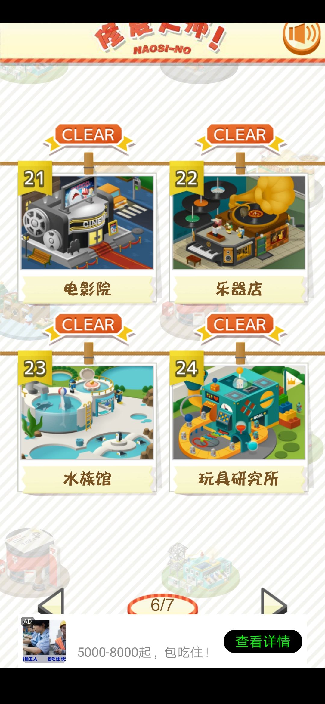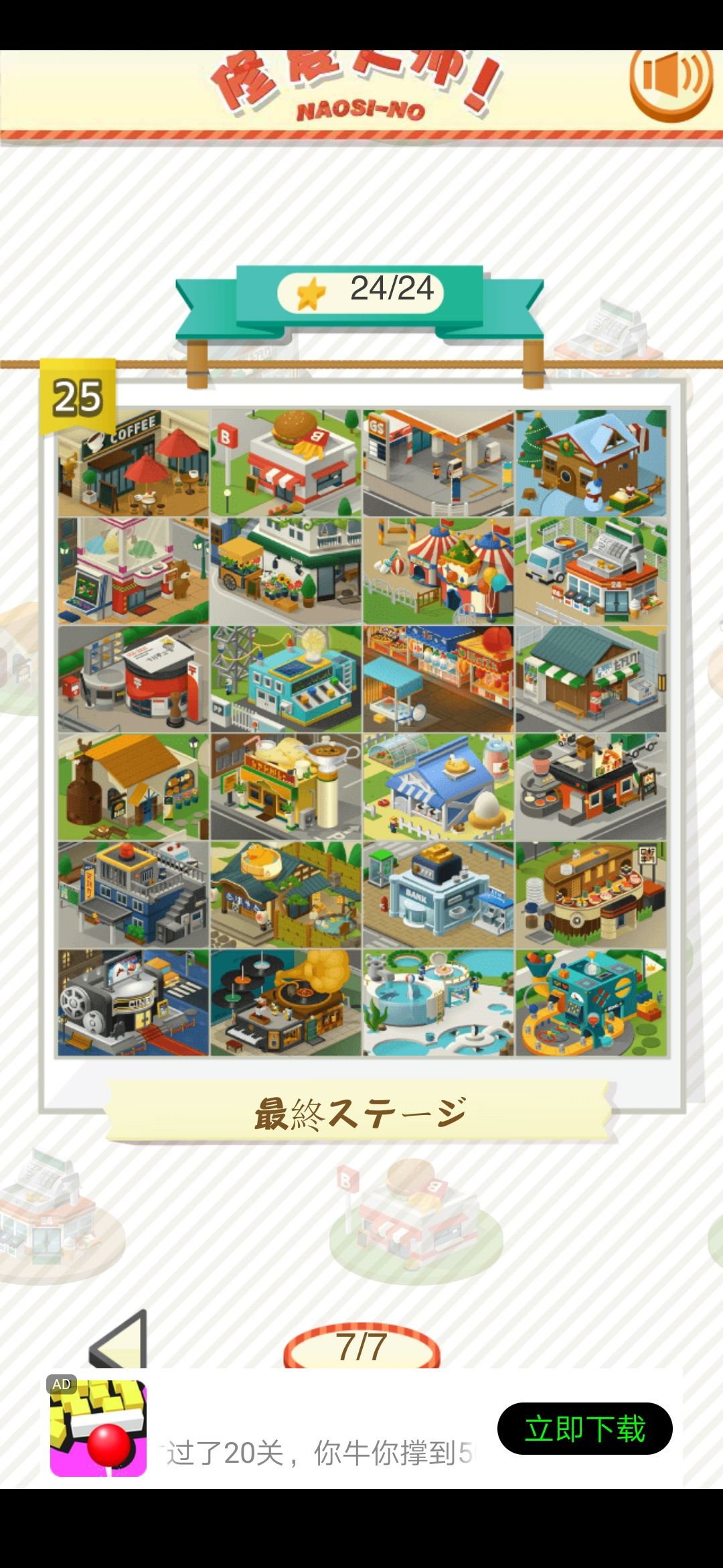 中午下了游戏…通关啦~总得来说游戏很不错…后面的难度也比之前稍微大一点。但是有一点~不知道大家有没有-_-我玩几关再点下一关就点不了…然后我再退出去重新进来才可以玩~总共24关的修复~第25关应该算彩蛋吧