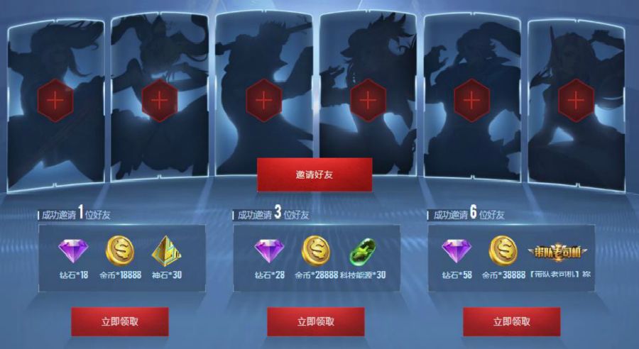 集结好友大礼包二:成功邀请3位好友,即可获得:钻石*28;金币*28888;科技能源*30。