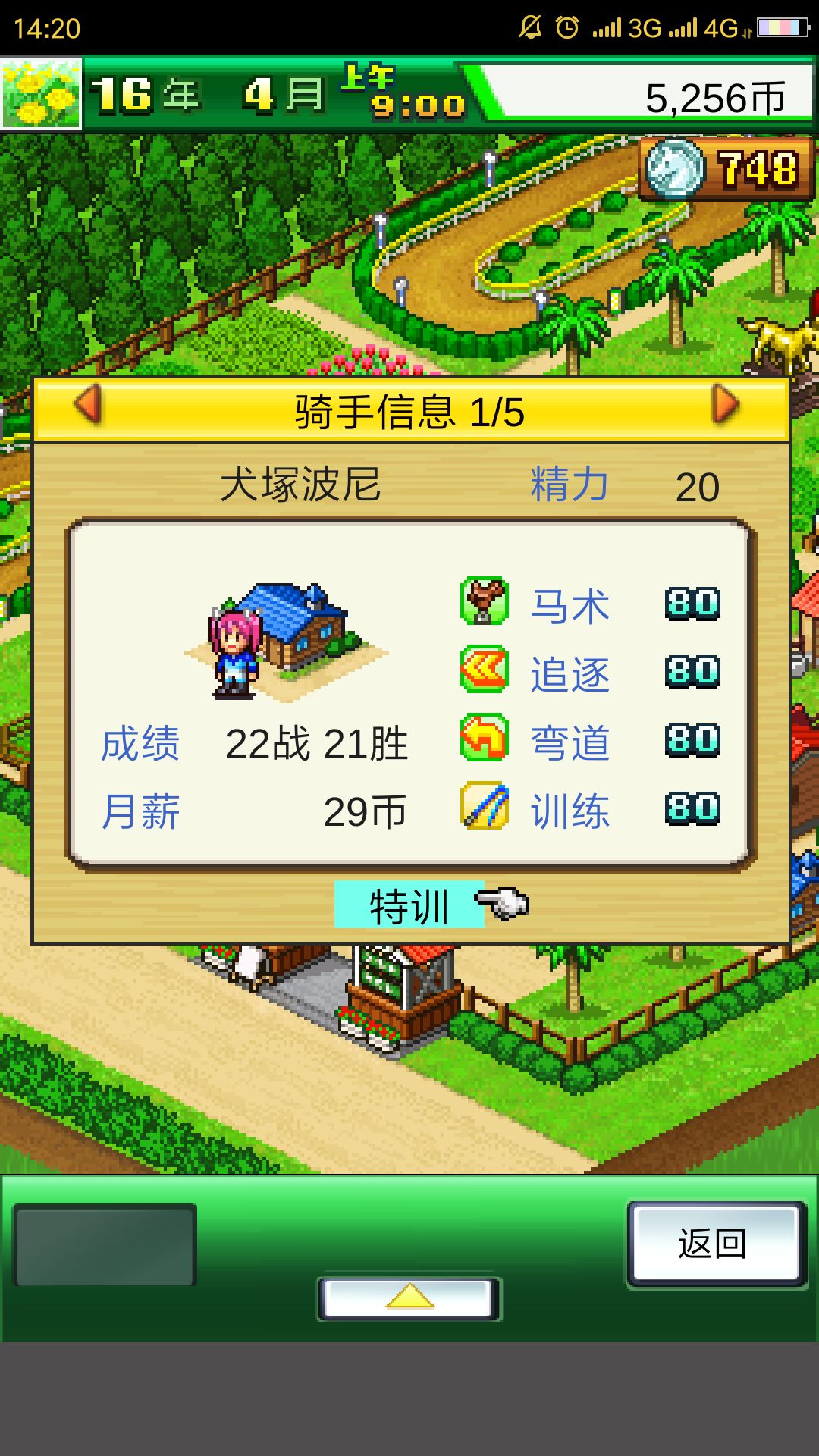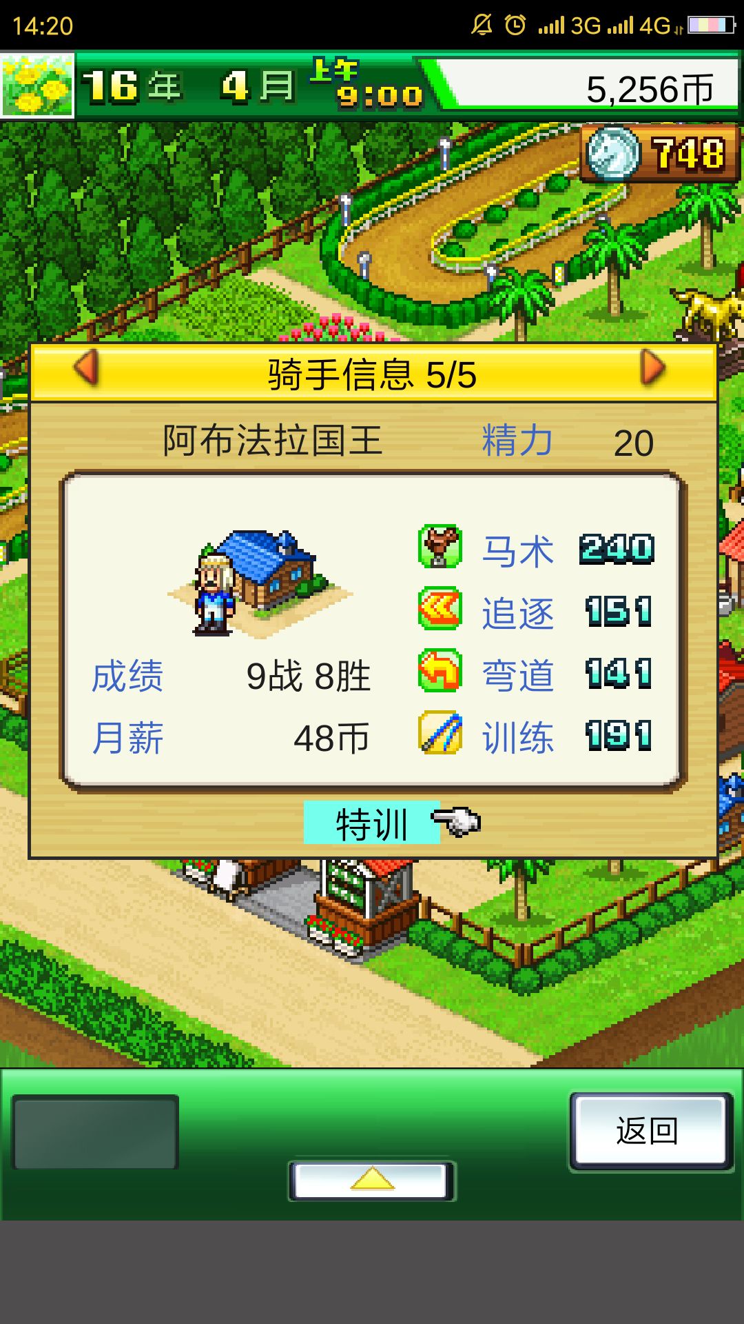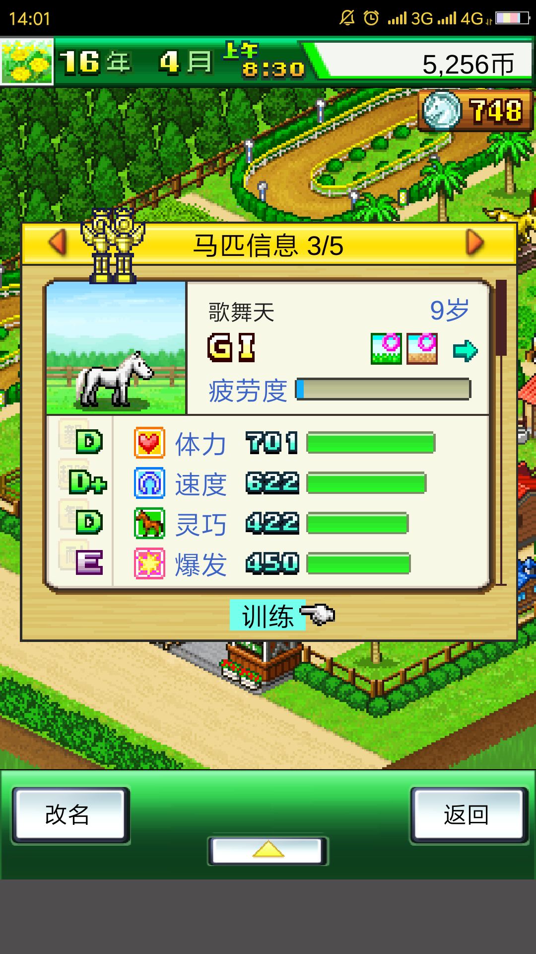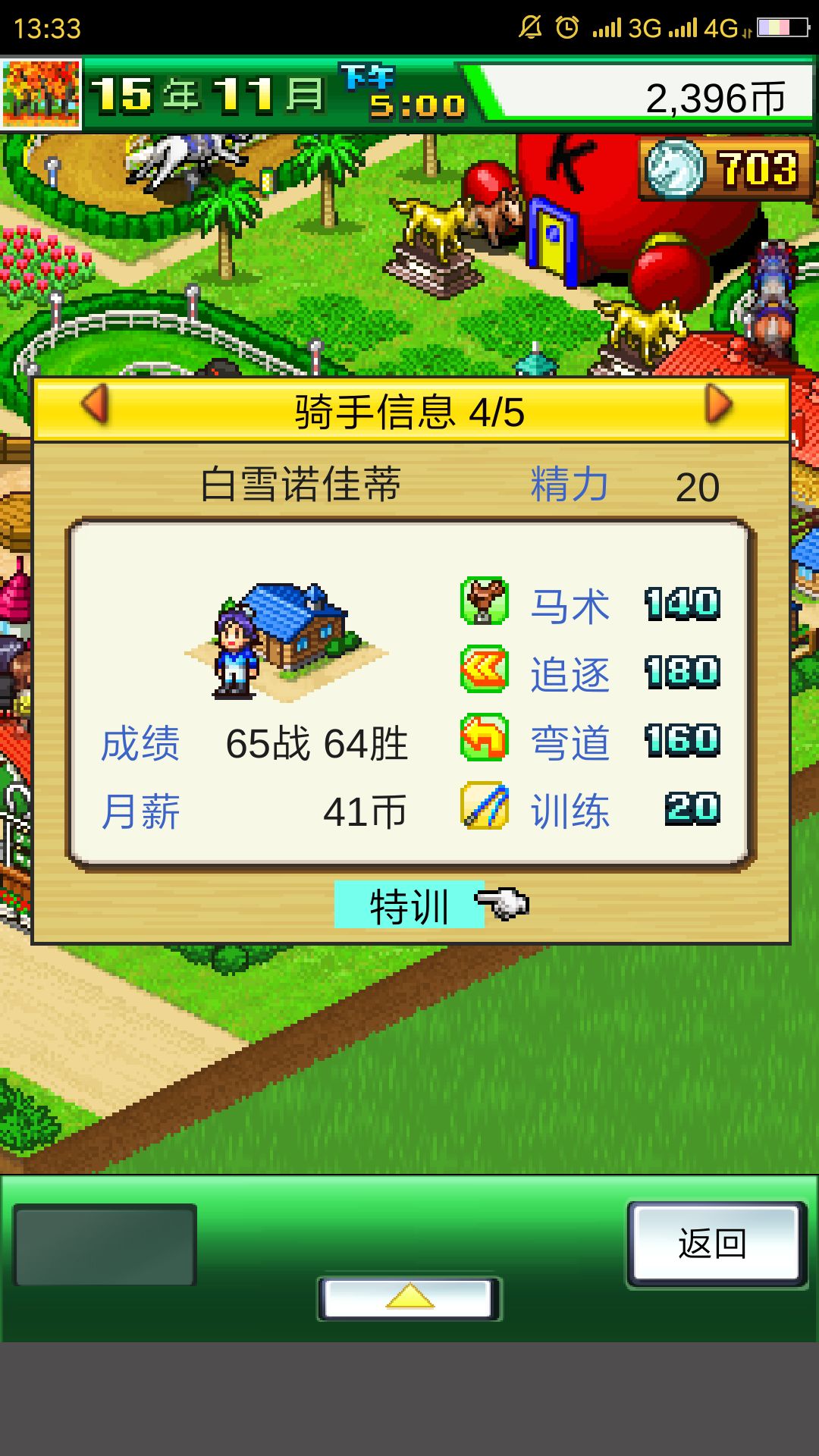 速度和体力是这个游戏中最重要的数据,其他的只用依靠血统好的马儿自身的能力就够了。买完马匹后我们先不急着参家比赛,将她的速度练到120或130以上。如果你想故意失败参加未获胜赛,也可以拿到加20速度的速度饲料,不过这个影响不大,要不要都可以,可以自行选择。