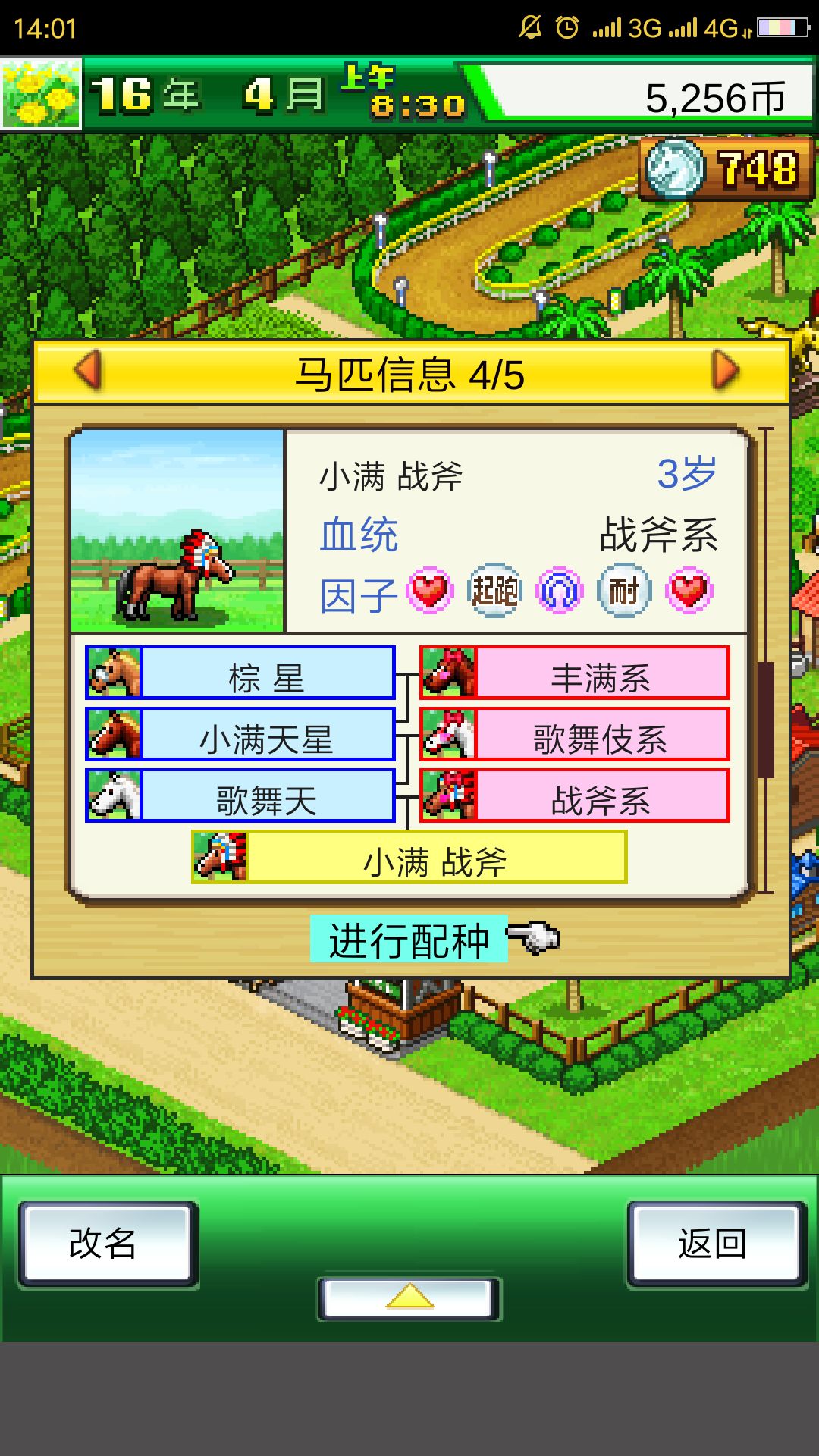 下面说一下我的方法,在进游戏后只有5000块的初始资金,一个马厩,一个宿舍,资源有限,所以我们采用集中培养的策略,不要买两匹马分开培养,因为第一初始马的潜力太低了,不值得投资,第二遗传因子的累积才是最重要的,两匹分开来走不同的路线话前期是无法承受这样的负担的。所以我们只用买一匹速度系的庄园马