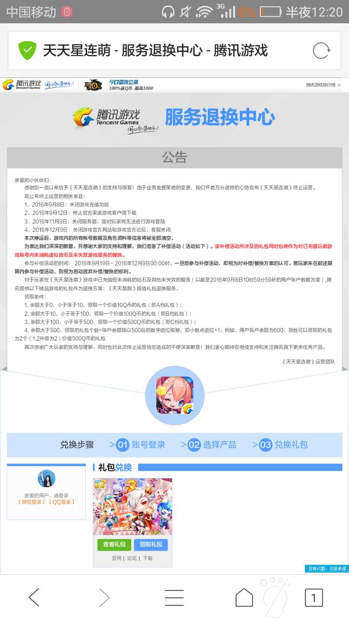 亲爱的小伙伴们:感谢您一直以来给予《天天星连萌》的支持与厚爱!由于业务发展策略的变更,我们怀着万分遗憾的心情宣布《天天星连萌》终止运营。现公布终止运营的相关事宜:1、2016年9月8日:关闭游戏充值功能2、2016年9月12日:停止官方渠道游戏客户端下载3、2016年11月9日:关闭服务器;届时玩家将无法进行游戏登陆4、2016年12月9日:关闭游戏官方网站和游戏官方论坛、客服关闭本次停运后,游戏内的所有帐号数据及角色资料等信息将被全部清空。为表达我们深深的歉意,并感谢大家的支持和理解,我们准备了补偿活动(活动如下)。该补偿活动所涉及的礼包同时也将作为对已充值玩家游戏账号内未消耗虚拟货币及未失效游戏服务的替换。参与补偿活动的时间: 2016年9月19日- 2016年12月9日00:00时。一旦您参与补偿活动,即视为对补偿/替换方案的认可。若玩家未在前述期限内参与补偿活动,则视为自动放弃补偿/替换的权利。对于玩家在《天天星连萌》游戏中已充值但未消耗的钻石及其他未失效的服务(以截至2016年9月8日10时59分59秒的用户账户数据为准),腾讯提供以下精品游戏的礼包作为退换方案:《天天酷跑》超值礼包退换服务。领取条件:1. 余额大于0,小于等于10,领取一个价值10Q币的礼包(即A档礼包);2. 余额大于10,小于等于100,领取一个价值100Q币的礼包(即B档礼包);3. 余额大于100,小于等于500,领取一个价值500Q币的礼包(即C档礼包);4. 余额大于500,领取的礼包个数=账户余额除以500后的数字进位取整,即小数点进位+1;例如,用户账户余额为600,则他可以领取的礼包为2个(1.2升级为2)价值500Q币的礼包再次感谢广大玩家的支持与理解,同时也对此次停止运营给您造成的不便深表歉意!我们衷心期待您继续支持和关注腾讯旗下更多优秀产品。