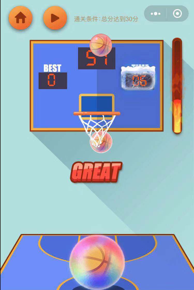 百发百中:限定时间内的所有投出的篮球都将进框,特点是球身会冒火。