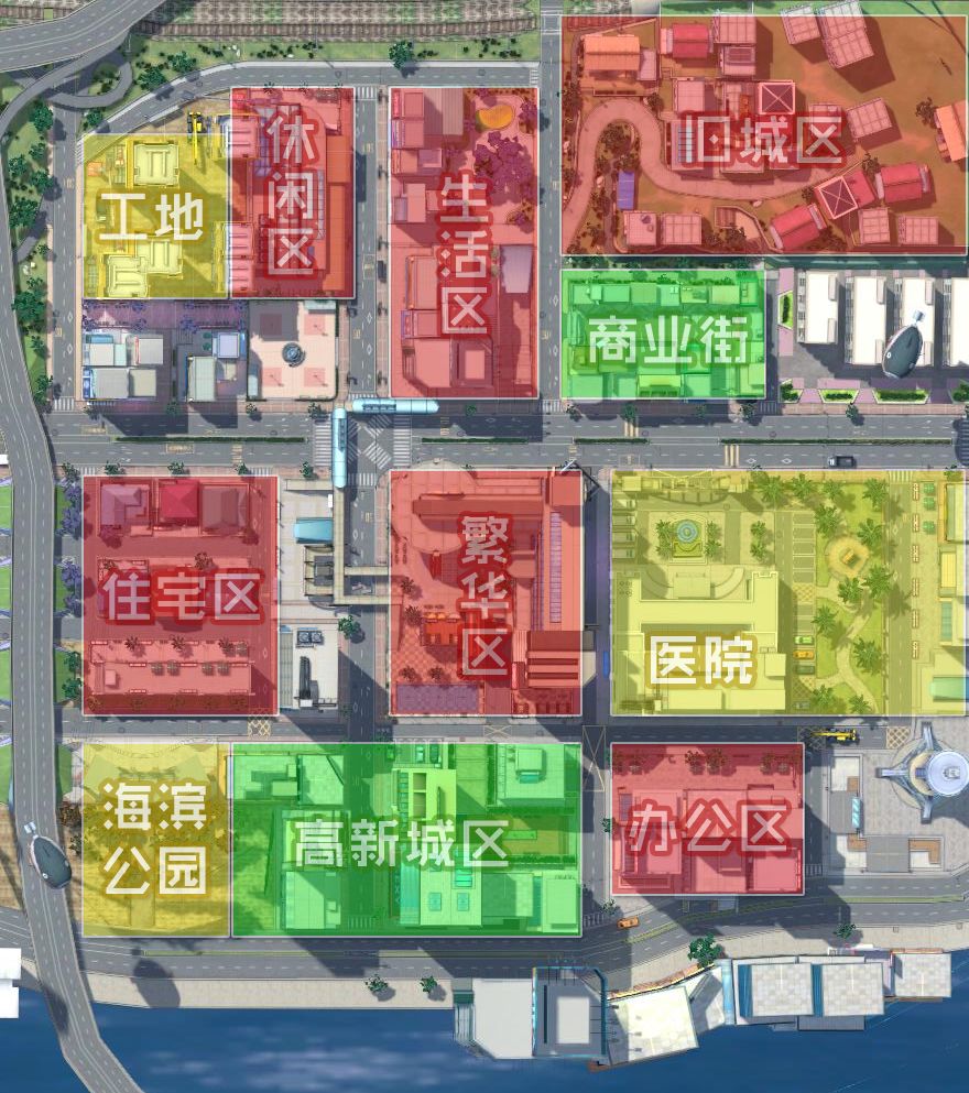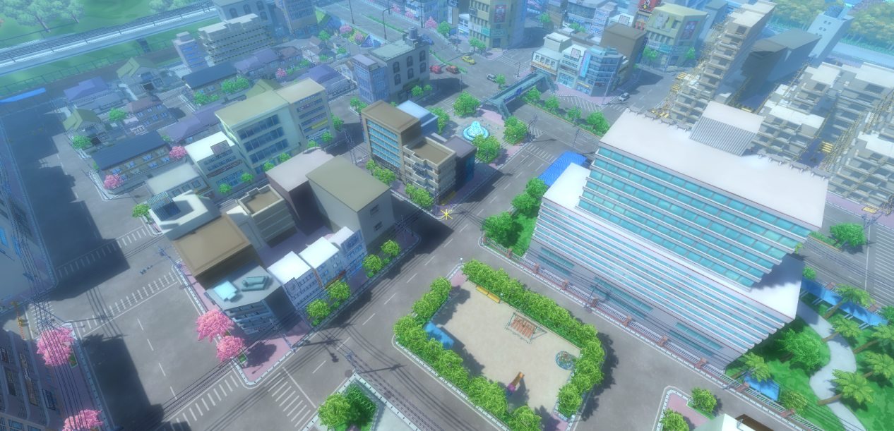 新城市主要有6大区域,分别为旧城区、生活区、休闲区、繁华区(中心区)、办公区、住宅区,新增一条主干道横穿其中,以繁华的商业街为中心向外扩散。其中,商业街作为整座城市中最热闹的一个区域,主要的参考对象是日本二次元圣地秋叶原,以及商业胜地大阪心斋桥。