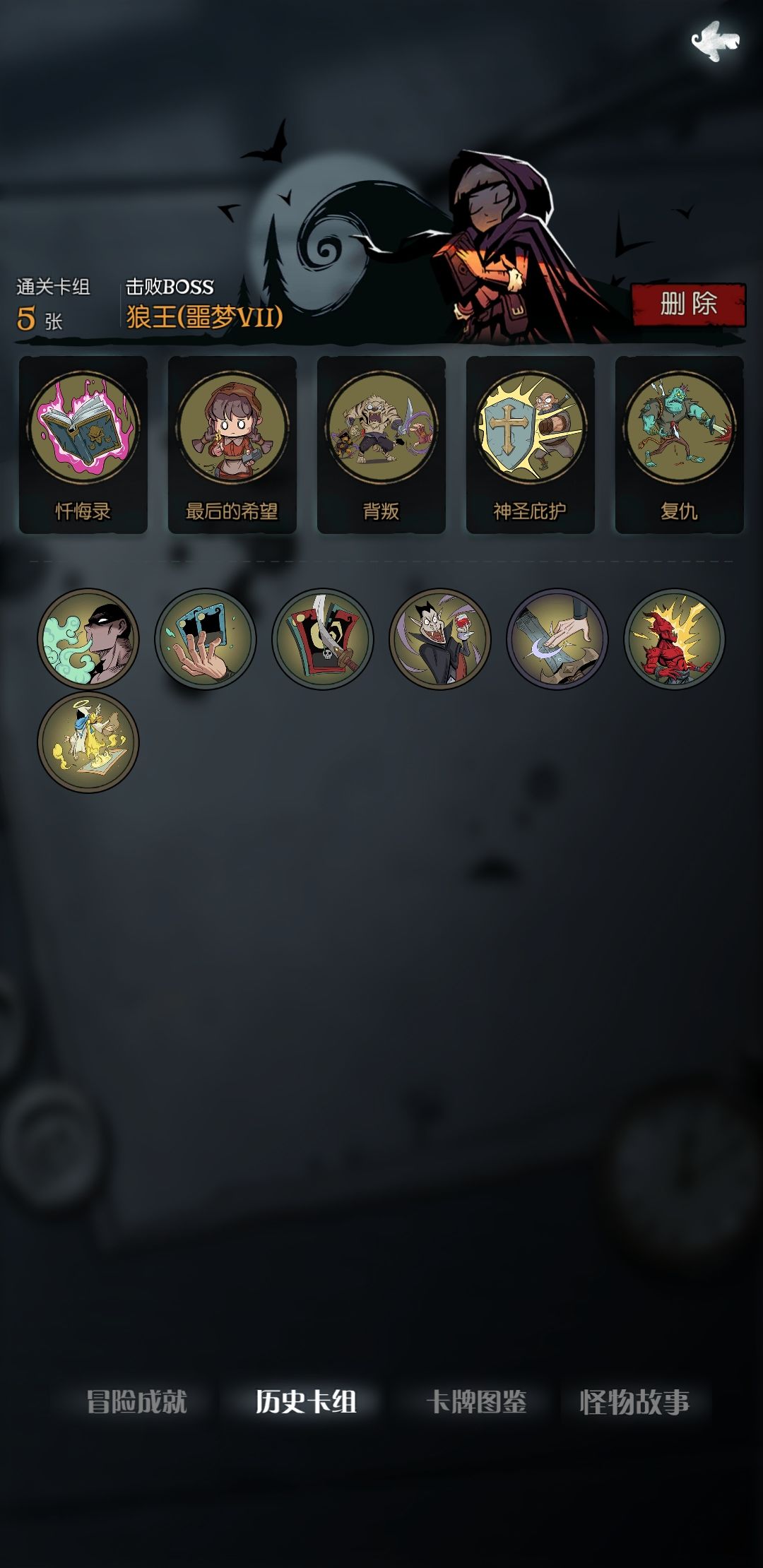 ps:卡组里之所以还有忏悔录+无敌是因为本来想用忏悔录的回合开始自残2血的效果杀死狼王,可是实际上忏悔录的回合开始的效果在最后的希望扣血效果之前生效,也就是-希望再一回合-忏悔扣2血-自身血量变为1,所以忏悔的希望望失败了,只好转为复仇的希望望![[嗒啦啦2_吃瓜]](https://img.tapimg.com/market/images/6eb1d083dff1c09692102cb5a98727f3.gif)