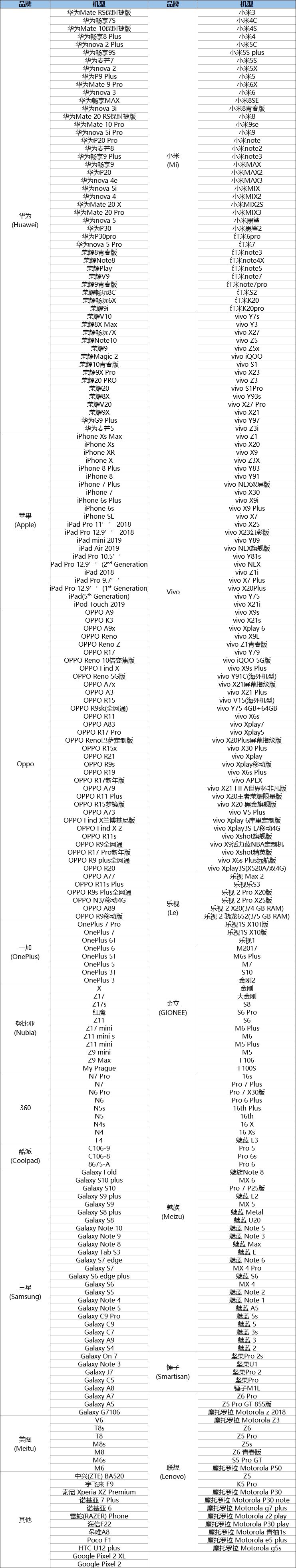 以下是适配机型表