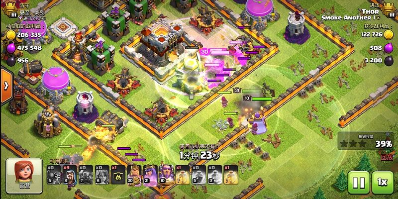 在操作合理的情况下,高爆发的皮法武神流威力十足,今天带来的案例就是尝试在泰坦杯段用皮法武神流派进攻十一本。在本场对战中,敌方处于十一本中后期,无论是城墙还是防御设施都较为完善,采用的是多层回形阵,尽管强度不大,但引导效果不错,很容易让进攻的陆军单位跑偏或陷入凿墙的消耗中。