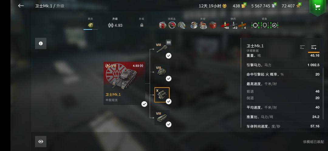 天顶星十级发动机,1092的引擎马力,24.2的推重比,稍微放宽了的皇家红茶限速器,极速46。。。(至少比原版的40快了些),机动确实很好,算是高机动中坦,如果把限速器拆了我怀疑这玩意可以像CDC那样飙车。