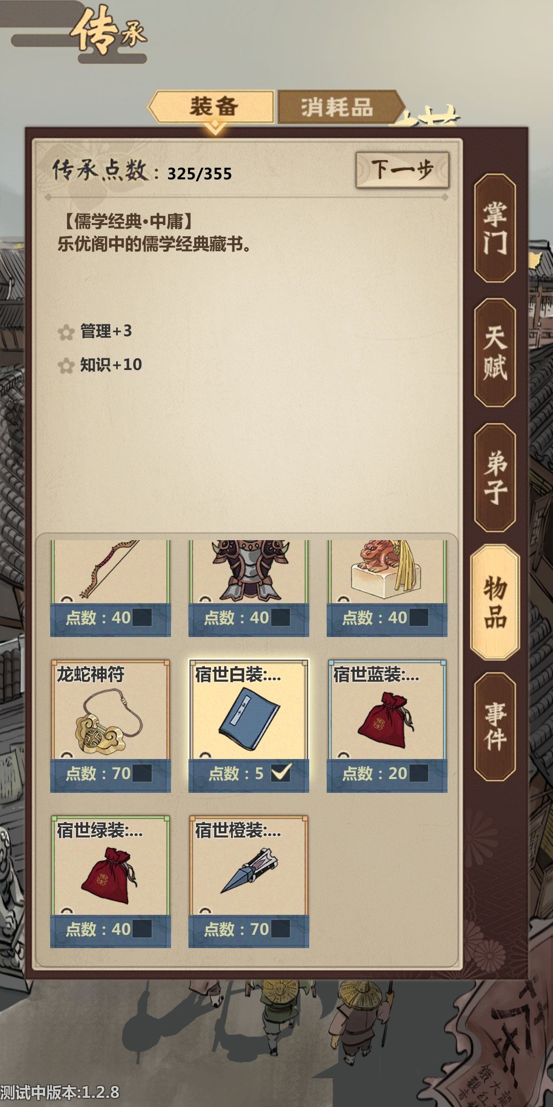 说完弟子再说说装备,目前装备需要的分值和其它同级初始装备一样,目前感觉除了白装,其它都不如同级初始装备。在有工具人的情况下,其它各级宿世装备感觉就是在浪费传承点。