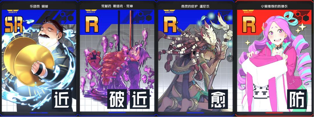 以一张【蓝】【近】攻击卡为主要输出手段,【近破】为对【防】卡进行输出,【愈】和【防】卡进行续航的卡组。【红】【愈】是防止被属性压制。