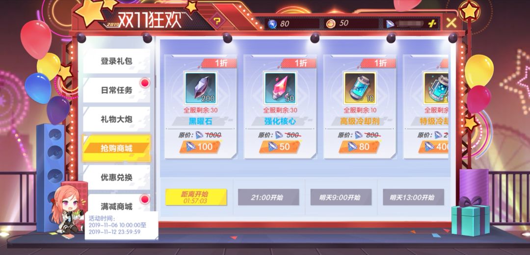 抢购商城,就是全服限时限量抢购,拼的就是手速(网速)!!当然同一时段每个道具只能购买一次哦~