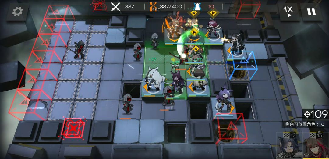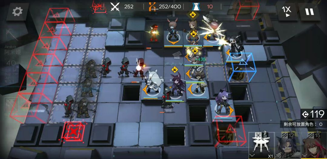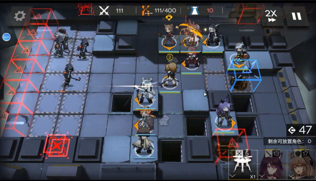 场上的布局如图,注意摆放顺序,先上先锋回费,然后是暗索,接着是输出奶妈,最后是玫兰莎和肉盾,这样可以让肉盾和玫兰莎吸收伤害。