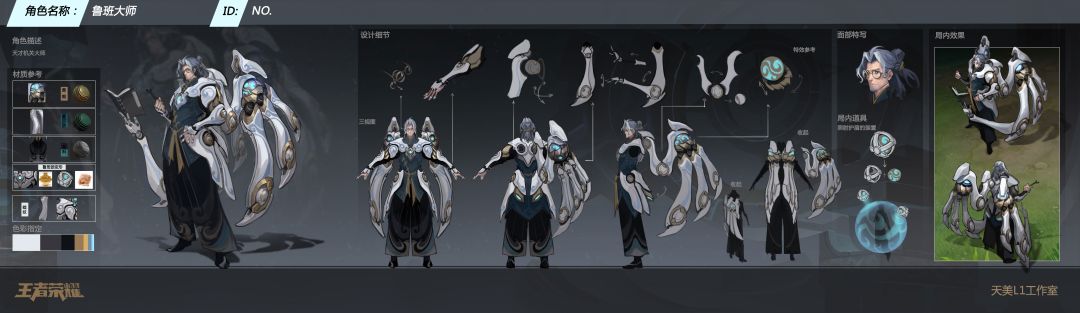 外形上,控制多机械臂的设计,突出其醉心机关术,高智商、严谨的科学家形象