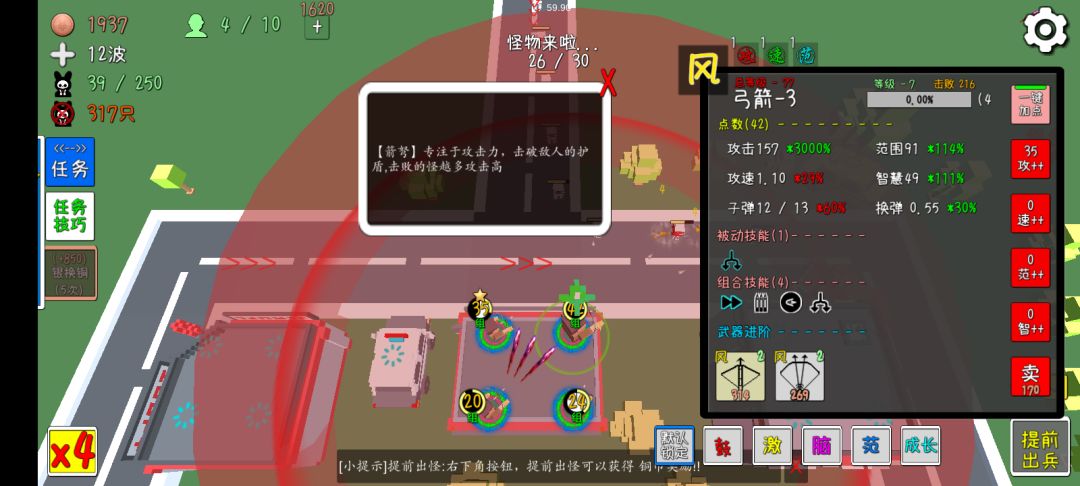 可以使用四个坑的组合,可以二伤弓二弩,就是弩旁边的升级,再出现分支的时候选左边,前期适用,如果还是不行就是用枪枪弓弓的组合。