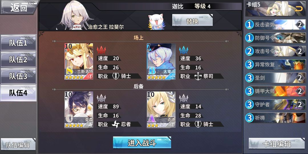 卡组如图(虽然我打的时候带了,不过这一套里圣剑没用,替换成威力强化,复合强化,不稳定能量中任一一种,祈祷最好替换为分裂孢子)人物:太宰3星以上即可,亚森(或任意高速人物)速度需要高于83(高于2面白狗),兰斯5星觉醒,贞德可以不要打法:刷开局守护者或防御号令,让兰斯进防御状态,太宰清理异常以及治疗,兰斯行动就和亚森交换,下一回合再换回来(兰斯洛特行动顺位最末,亚森行动顺位第一,可以让兰斯洛特轮空一回合,保证太宰每两回合可以用一次大治疗而不用清理异常),叠甲牌和提升威力的牌拿到就给兰斯用,反击(其实也可以不用)和攻击号令留手上(进2面前需要叠出+32以上的威力且带有远古状态,手上留有两张攻击号令),等叠加出足够的加成就让太宰和亚森替换,兰斯手动或反击打完一面(不会掉buff,可以放心打)2面一张攻击号令秒杀白狗,白熊隐身就顺劈,进3面3面敌对49血35甲30速(所以需要+32以上的威力提升),攻击号令加亚森技能破除护盾(然后目标破盾减30速就被援军打死了)以上为大致流程,如果有什么地方出错,还希望指出