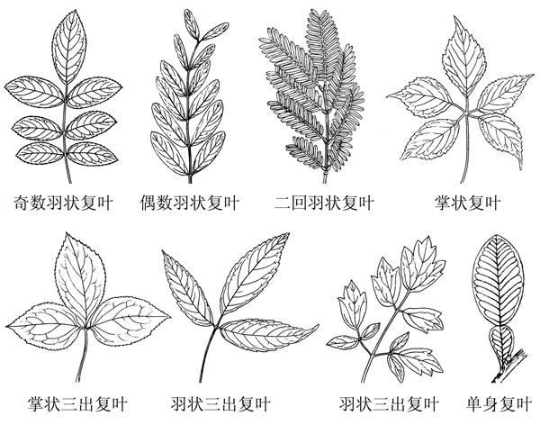 百度百科:复叶:二至多枚分离的小叶,共同着生在一个叶柄上,称为复叶。复叶的叶柄称总叶柄,它着生在茎或枝条上。在总叶柄以上着生小叶片的轴称叶轴。根据小叶在叶轴上排列方式和数目的不同,可分为掌状复叶、三出复叶、羽状复叶。复叶是由单叶经过不同程度的缺裂演化而来的,当单叶的裂片深达主脉或叶基并且形成小叶柄时,复叶便产生了。