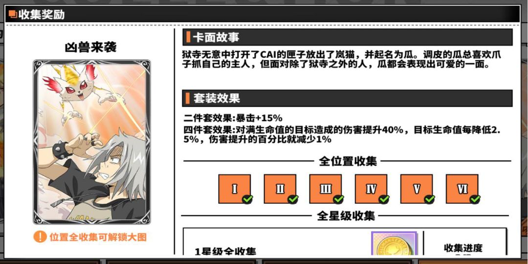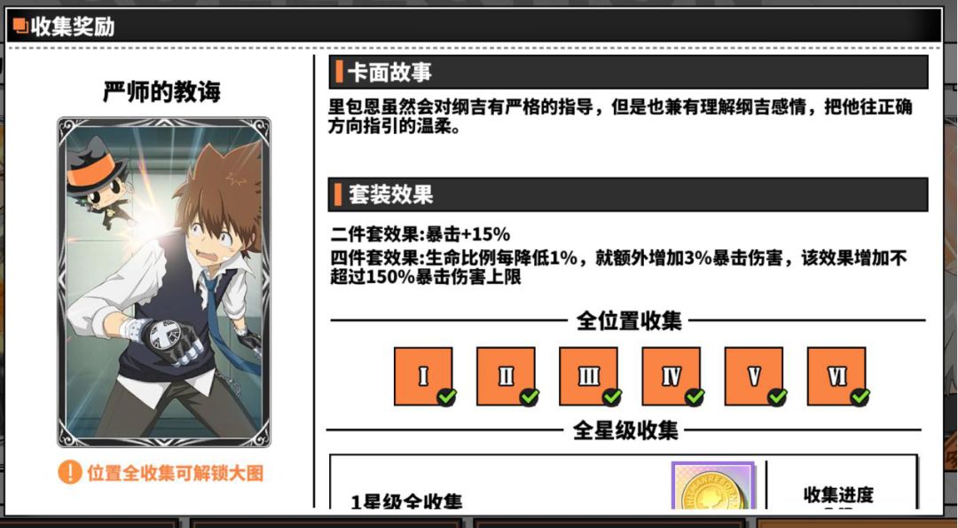 严师的教诲四件套效果为自身生命值降低额外增加自身暴击伤害,适合泽田纲吉▪未来篇、泽田纲吉▪戒指篇,配合两件吸血卡或者暴击卡可以做到绝地反击,主要用于pvp,也可被擅长控血的玩家用于打究极模拟战,看个人兴趣。