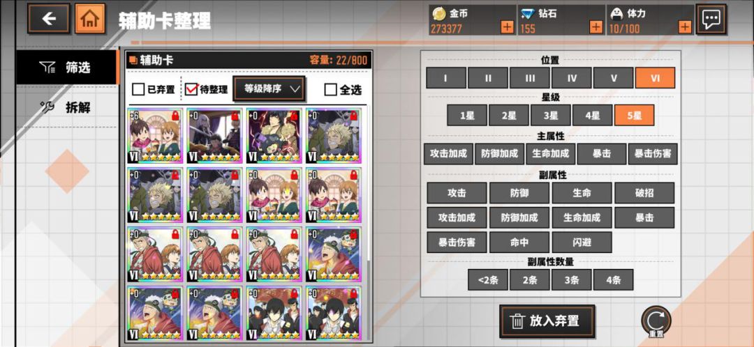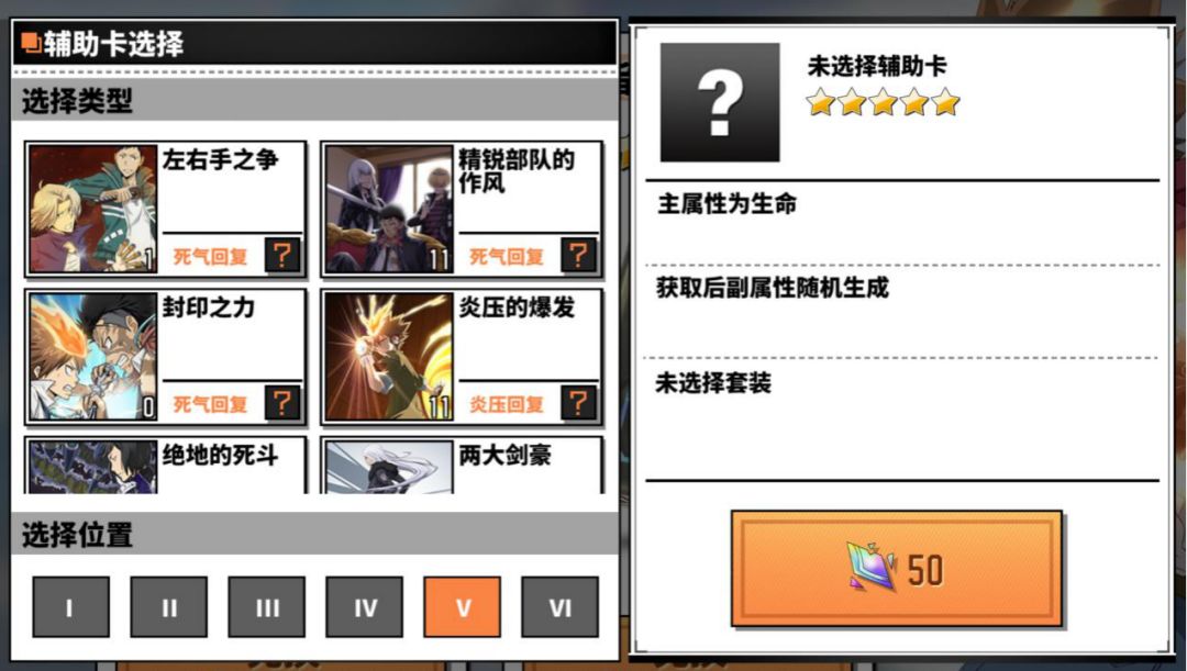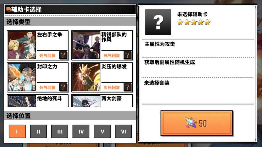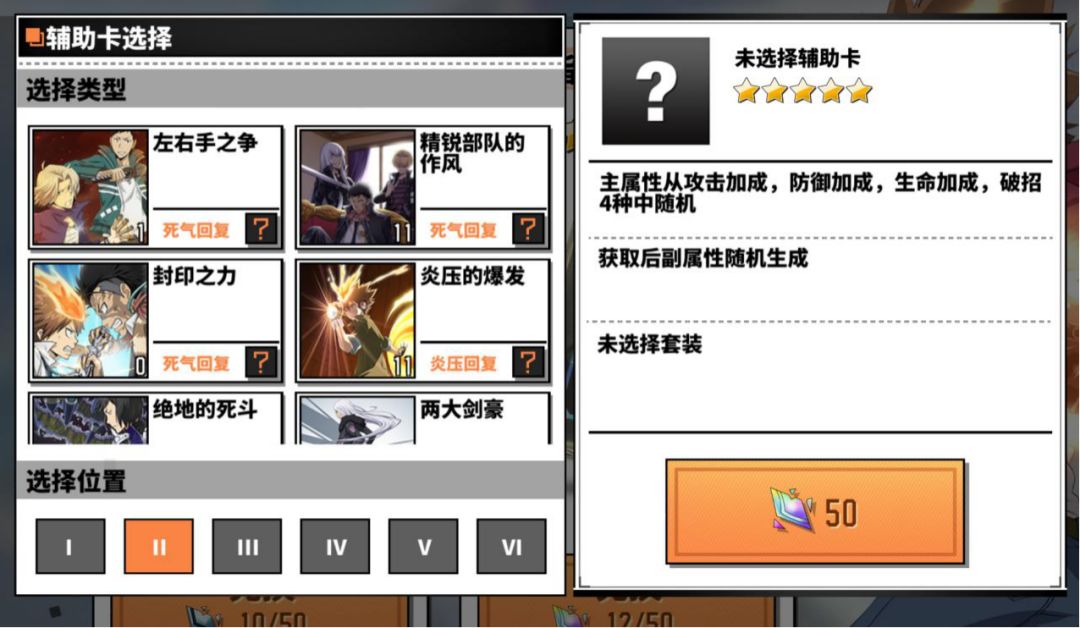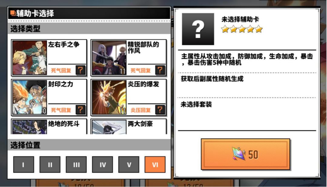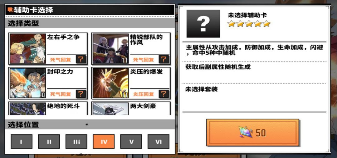 辅助卡按罗马数字的一二三四五六分为六个位置,每张卡都有一个固定范围的主属性和最多四个随机搭配的副属性。