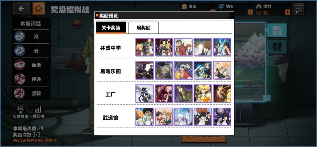 这三套卡可以参照下列这张究极模拟战奖励预览表来选择合适的关卡去爆