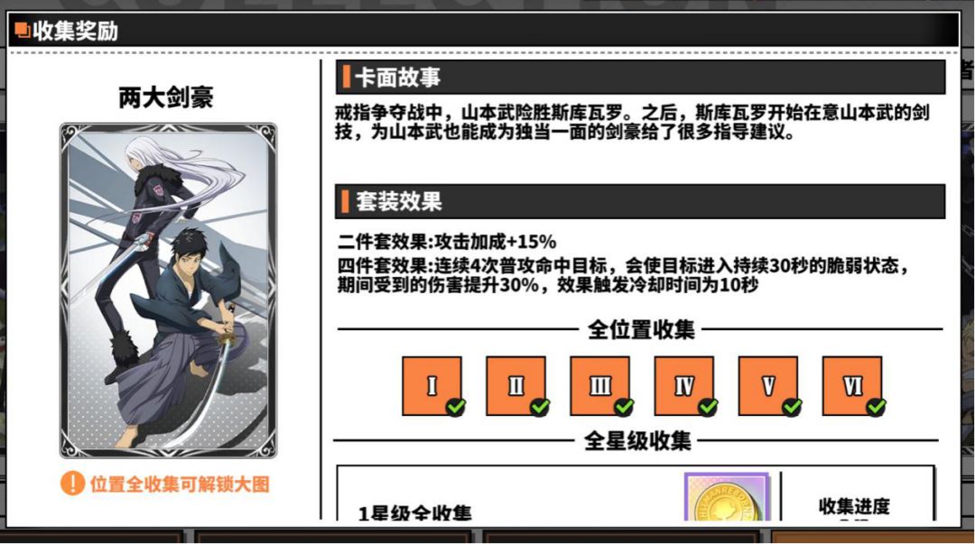 两大剑豪的四件套效果是普攻第四段命中对手会使其在之后的三十秒受到的伤害增加,这套卡适合斯库瓦罗,和斯库瓦罗的天赋被动以及戒指特性可以完美配合,这套卡适用于斯帕纳初级模拟战,强敌来袭,主要作用就是通过削弱目标来给己方输出型角色提高输出