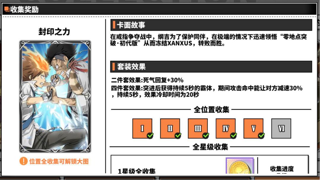 封印之力的四件套效果是在角色使用突进技能后获得一段时间霸体,期间攻击命中目标会使目标减速,这套卡适合有突进技能的角色,比如:云雀恭弥▪戒指篇、XANXUS、泽田纲吉▪戒指篇,这套卡适用于pvp,作用就是给自身加霸体状态来应对破招值比己方高的对手,借用短时间的爆发秒杀对方或者逼出对方的闪避。