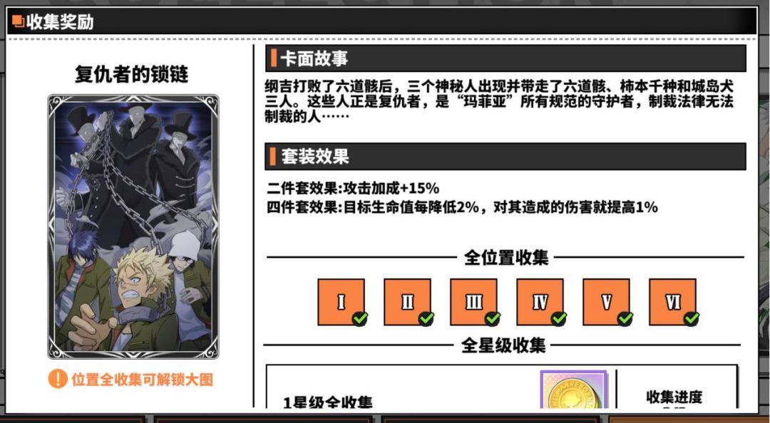 复仇者的锁链四件套效果是随着目标生命值降低,对其造成的伤害增加,最多49%,这张卡适合打后手收割目标的输出型角色,比如狱寺隼人▪未来篇(该角色也适合打先手)、贝尔菲戈尔,适用pve和pvp。