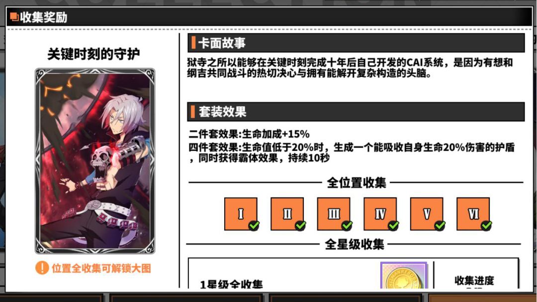 关键时刻的守护四件套效果是生命值低于一定值给自身加护盾和霸体状态,主要用于pvp,适合的角色有笹川了平、XANXUS、泽田纲吉▪未来篇这种耐打的角色,不建议脆皮角色用。