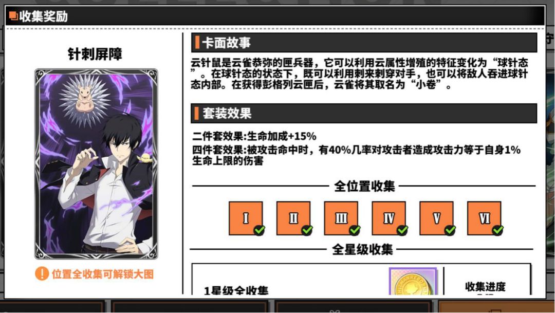 针刺屏障四件套效果被攻击命中有一定几率向对方反弹自身一定生命上限百分比的伤害,比较适合笹川了平这种生命值高的角色,在面对库洛姆、山本武▪未来篇这种攻击段数多且频繁的角色时比较有作用,这套卡主要用于pvp,在挨打的时候让对方受伤害。