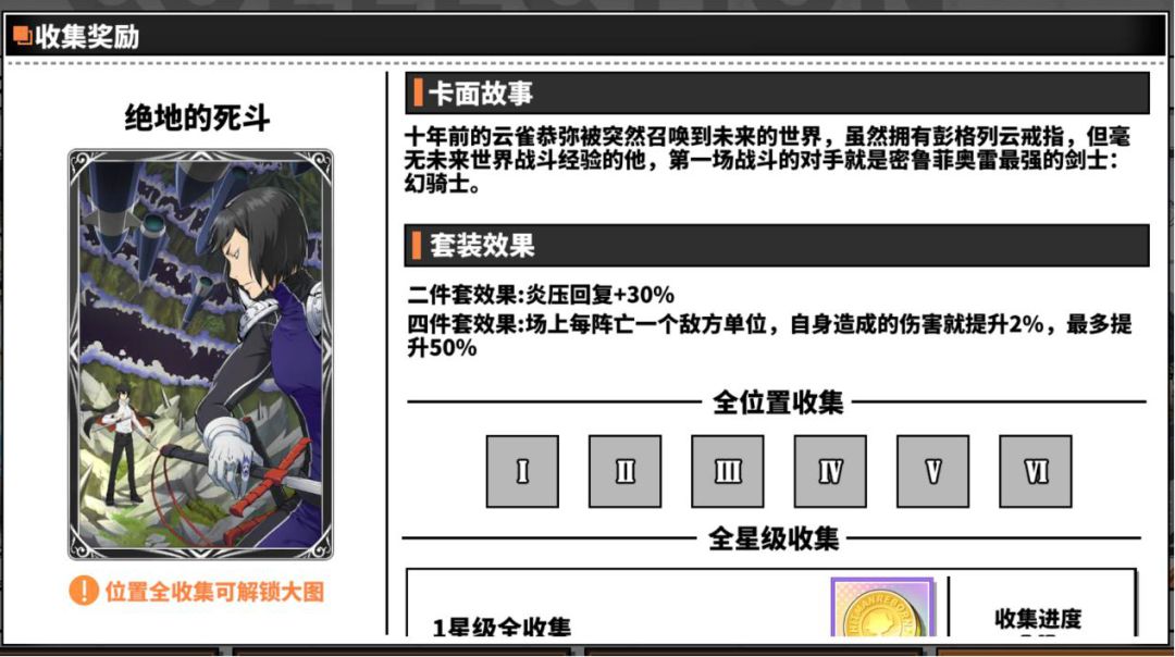 绝地的死斗四件套效果通过击杀敌方单位,按层数提高自身伤害输出,这套卡适用在斯帕纳究极模拟战以及斯帕纳自定义模拟战,主要作用是增加稳定输出,提高刷图效率,这套卡比较适用于贝尔菲戈尔、XANXUS这些pve热门角色
