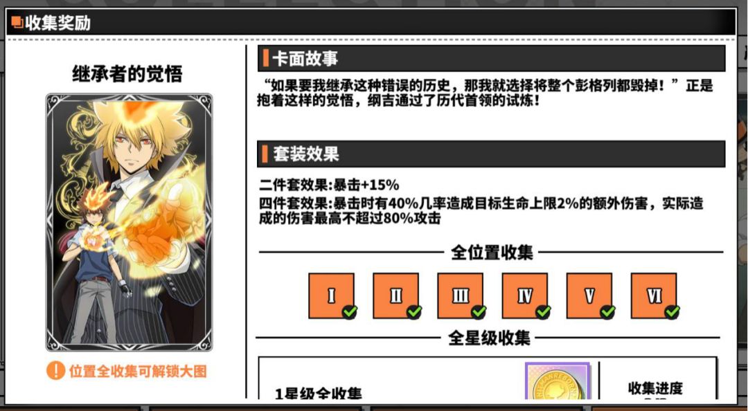 继承者的觉悟四件套效果为暴击时有一定几率对目标造成生命一定百分比伤害的额外伤害,这个伤害被攻击者自身攻击限定,这套卡是比较有人气的一套卡,究极模拟战的工厂经常会爆出来,适用于究极模拟战,适合技能段数多,攻击伤害触发频繁的角色,例如库洛姆、山本武▪未来篇,也可以被高攻击高暴击的角色使用来打初级模拟战和角色试炼。