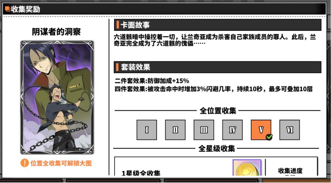 阴谋者的洞察四件套效果与暗中较量正好相反,受击会给自身增加闪避率,可叠加至30%,配合四号位主属性闪避卡,以及其他卡副属性闪避叠加闪避,以此可以无视对手大量的伤害,消耗对方时间和死气,这类卡多用于pvp,这套卡玩法属于比较少见的玩法,适合比较耐打的角色或者自带闪避的角色用,比如XANXUS、笹川了平、六道骸、幻骑士。