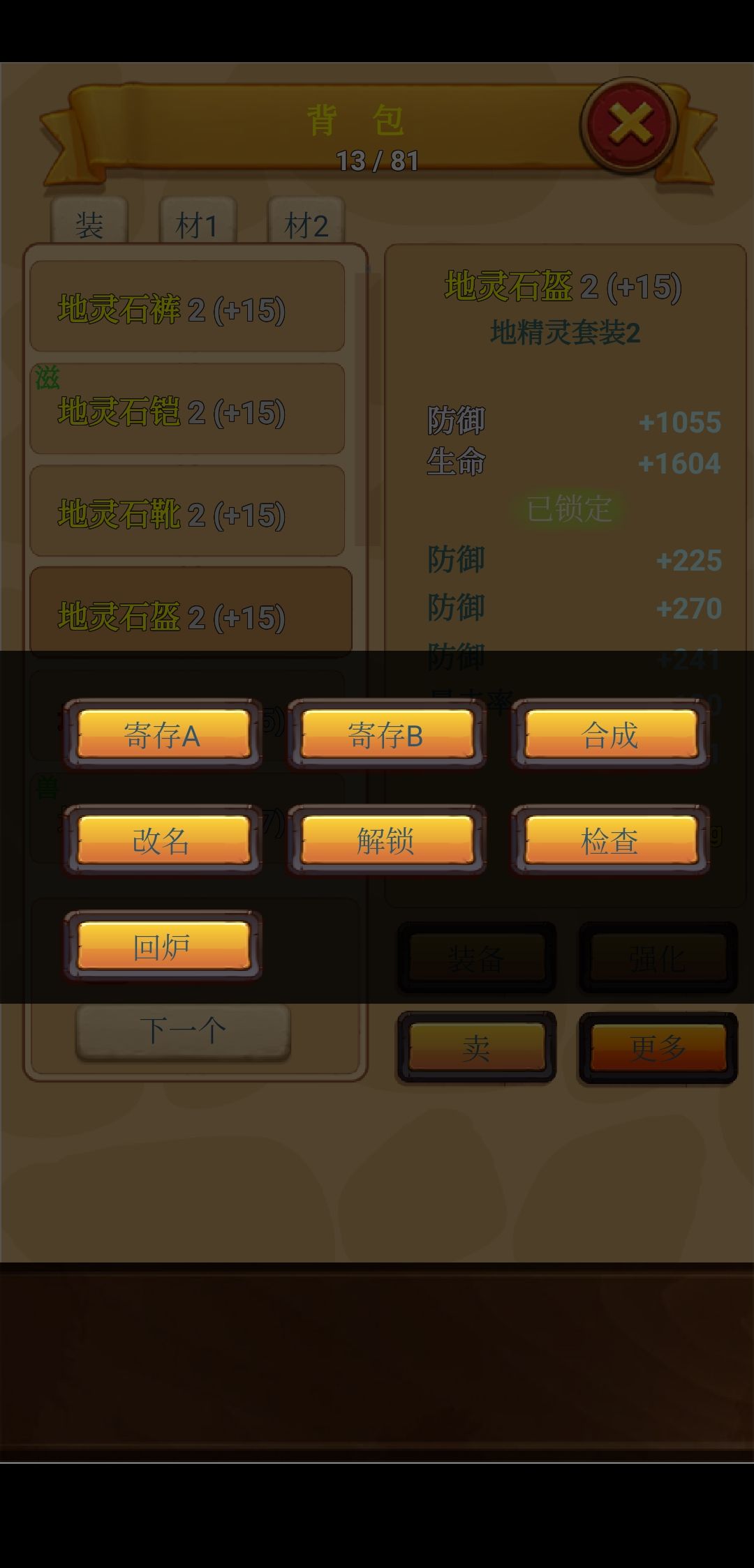 里边可以选择存放在A/B仓库,合成套装,修改装备名字,锁定装备防止误售,检查(合成以后看不到阶数,点击这个按钮可以看到装备原始等阶),回炉(刷新装备属性值,但原属性都不会改变)