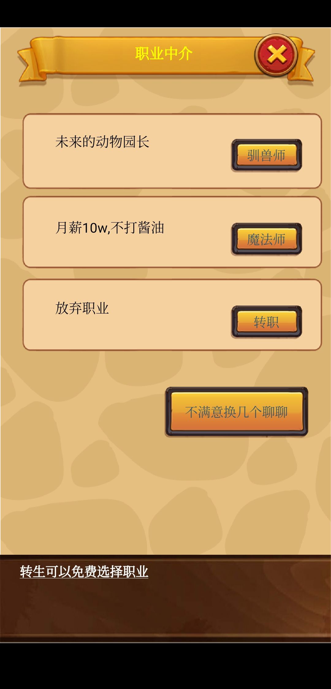 游戏有4个职业(点击不满意换几个聊聊,就可以刷新出别的职业,切换职业需要有相应职业介绍信)