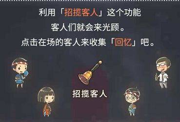 通过点击来访客人,可以获得回忆点数,从而增加摊位,开办各式各样的活动。