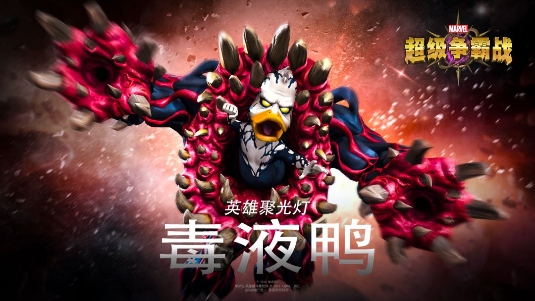 毒液鸭简介:源于争霸战自身的混沌能量创造出了这个凶神恶煞,以“至尊共生体”自居的怪物则将其改造成毒液鸭的外形。毒液鸭以自身的共生体体型强化自己和撕裂敌人。受到毒液的嗜血驱使和霍华德智慧与狡诈的操控,争霸战的这个异形生物绝对是一个不可小觑的力量。
