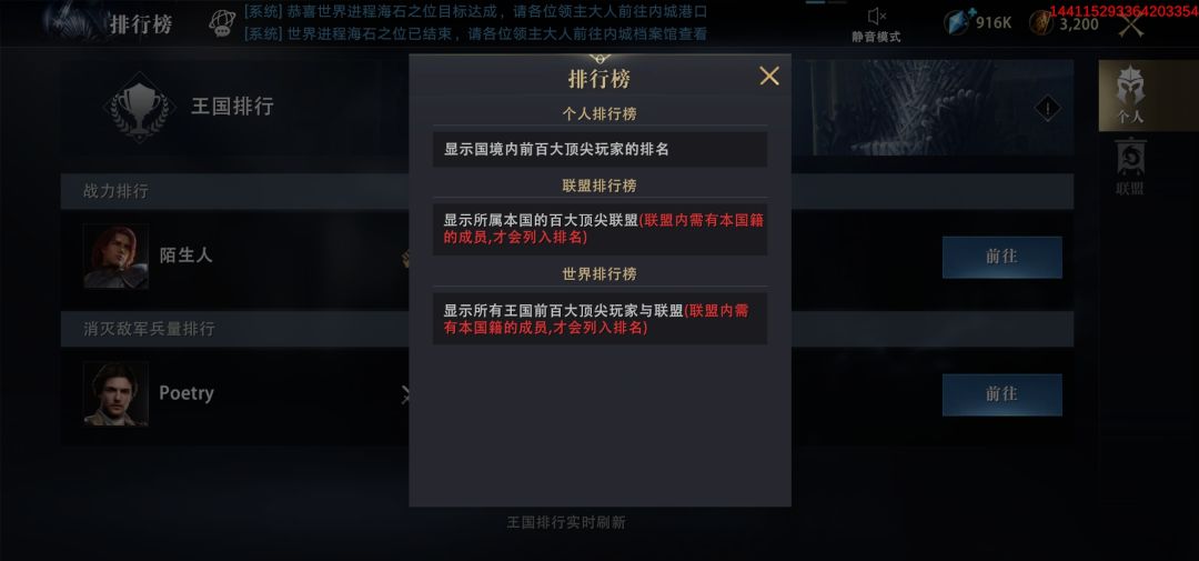 个人排行榜显示国境内前百大顶尖领主的排名,其分为[战力排行]和[消灭敌军兵量排行]两个个人排行榜,从[战力排行]入口进入后,将查看到国境内战力排行前一百名的领主;从[消灭敌军兵量排行]入口进入后,将查看到国境内消灭敌军兵量排行前一百名的领主。