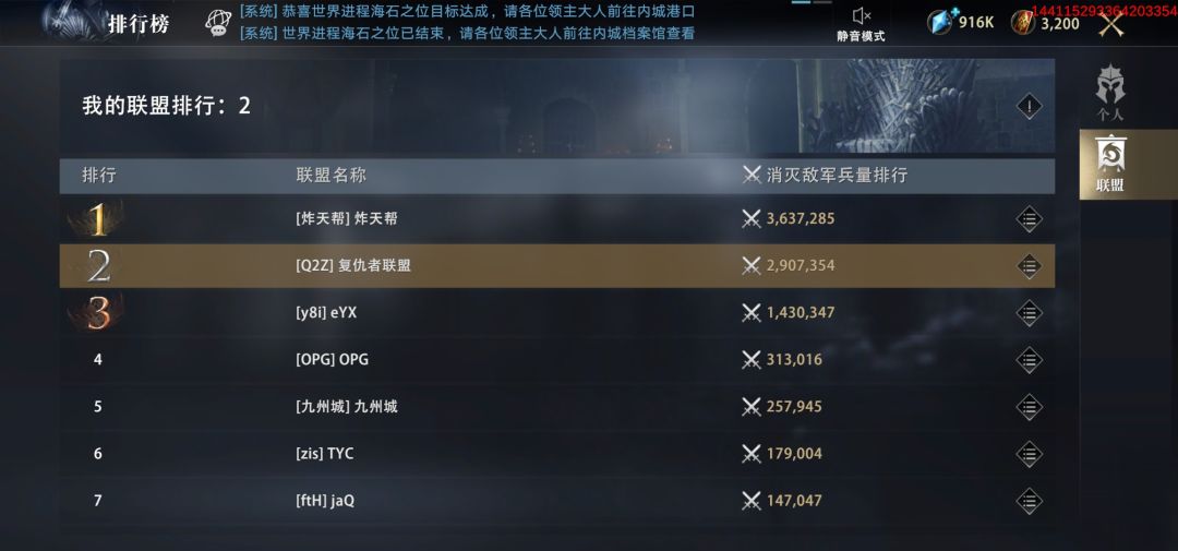 世界排行榜显示所有王国前百名顶尖玩家与联盟,同样也有[战力排行]与[消灭敌军兵量排行]两个分排行。