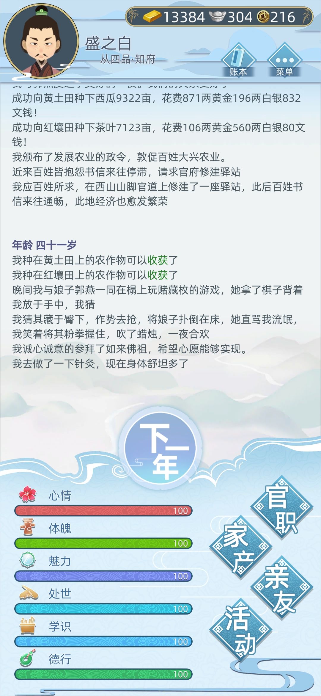 ③:如果想持续发展的话,可以选择跳河,然后继承重开,推荐在40岁~50岁之间跳河,因为大部分人的儿子这个时候都是18岁,时间最好。④:中后期(大概2000~10000+亩土地)后,这个时候,种田就很赚了,种一次田基本净赚200~300两黄金。这个时候官职基本都没有用了,时不时过一下任务就行。如果不想当官,告诉一个窍门(当前版本的一个bug)可以到寺庙里找住持聊天,有几率刷出当和尚职业。当了和尚后,再还俗,之后你就不是官了,但是家产一点不少。最厉害一点,朝廷给你的房子还是你的,不会收回。但是只有这一世。 具体种那种植物赚,那种土地赚,论坛里有大佬亲测发的攻略,可以看一下。 记住,不论哪个时间段,种田一定要看广告施肥,特别是后期,施肥有些时候可以多净赚几百两金子。 注意:买房子一定要慎重,如果一定要卖,就发帖出售。典出有很大几率坐牢,而且赚的比前者少,稳亏不赚。坐牢了,你就啥都没了。重开吧。当官一定要注意,不要贪污受贿,一旦翻车杀头了,你也就啥都没了。 新人发表,有错勿喷,谢谢!![[嗒啦啦2_新年好]](https://img.tapimg.com/market/images/6ec3c3994084e0de0a8dd9c936f90638.gif)