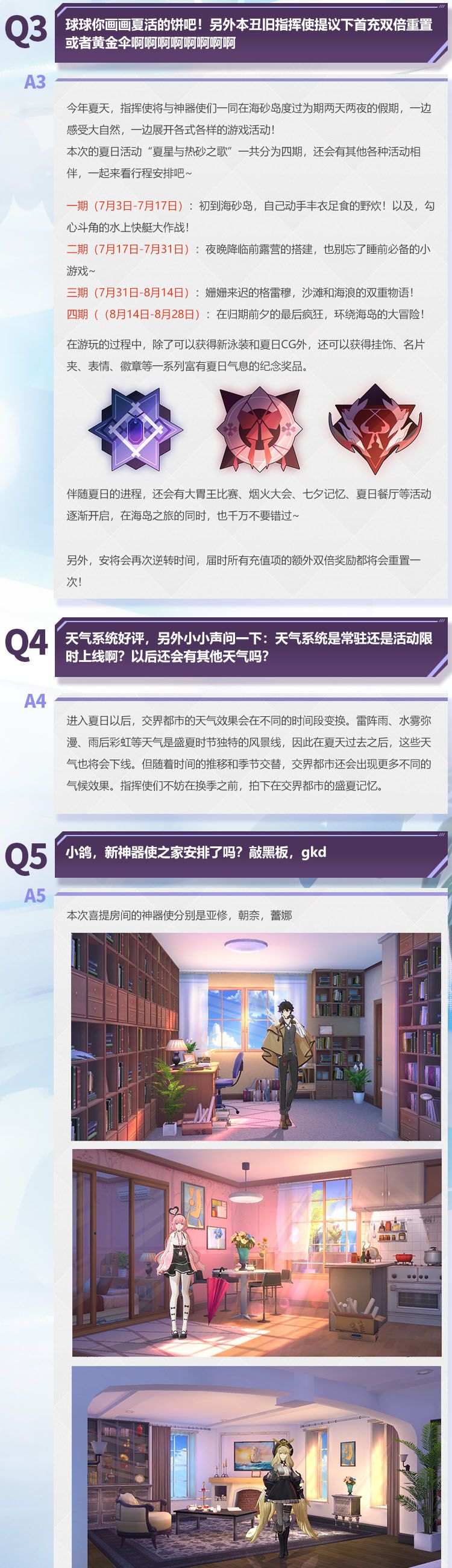 夏日炎炎,正值酷暑。本期饲料站,不仅给大家带来了夏日活动的全部日程安排,新周边设计、同人创作活动的情报,同时对大家关心的信物系统及每日纪念券补给数量问题也做出了相应的回复哦!此外,有哪几位神器使喜提新房间,伊萨克的泳装又是怎么样的?赶紧戳图了解吧