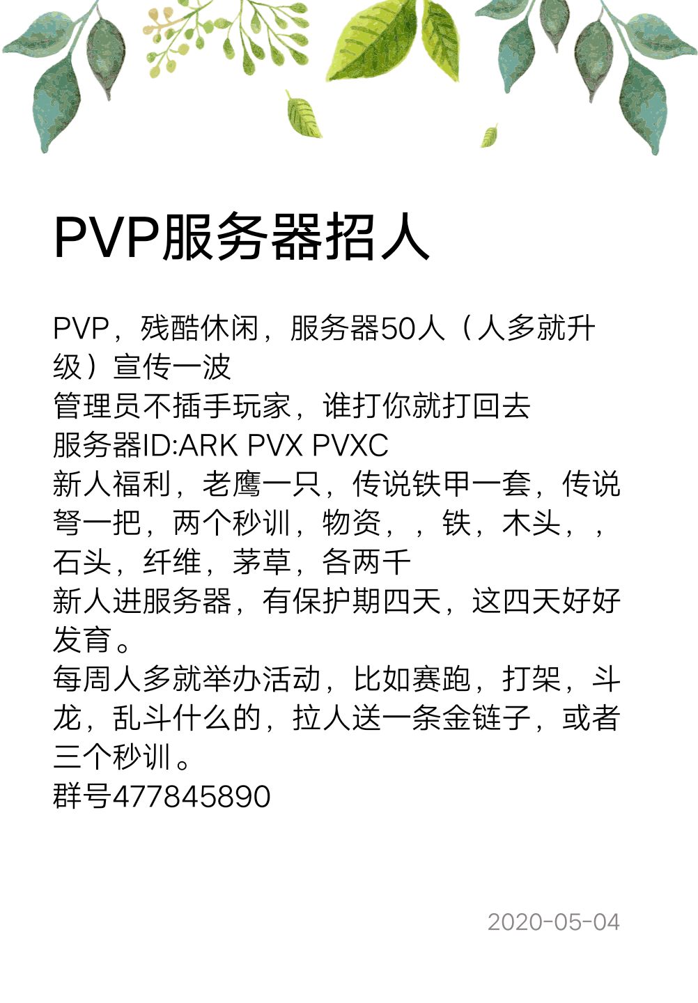PVP,残酷休闲,服务器50人(人多就升级)宣传一波管理员不插手玩家,谁打你就打回去服务器ID:ARK PVX PVXC新人福利,老鹰一只,传说铁甲一套,传说弩一把,两个秒训,物资,,铁,木头,,石头,纤维,茅草,各两千新人进服务器,有保护期四天,这四天好好发育。每周人多就举办活动,比如赛跑,打架,斗龙,乱斗什么的,拉人送一条金链子,或者三个秒训。群号477845890
