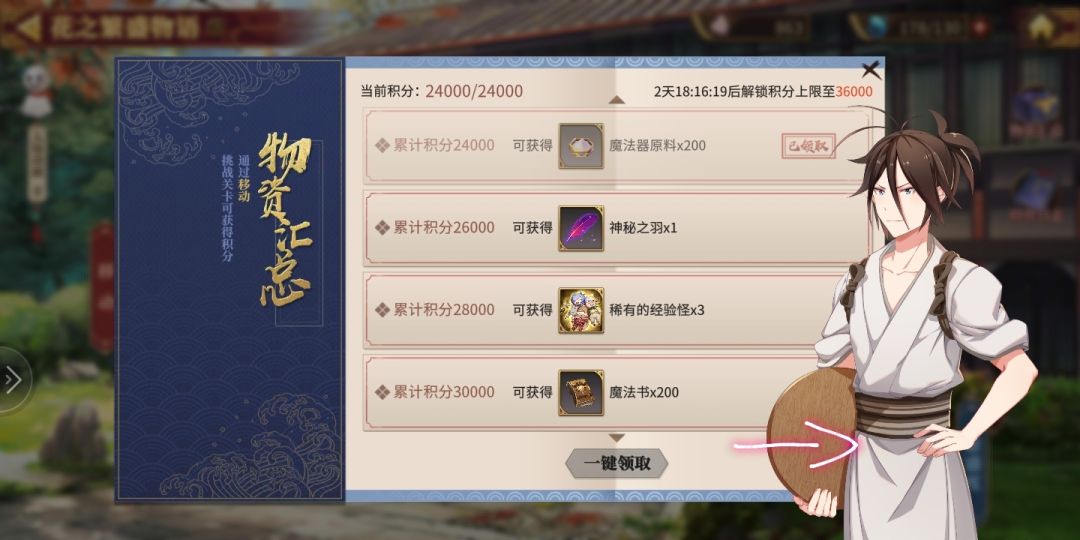 (注: 1,周目结算需要到第三天完成所有任务后,再做完成,否则将会无法达到100+繁盛度!
