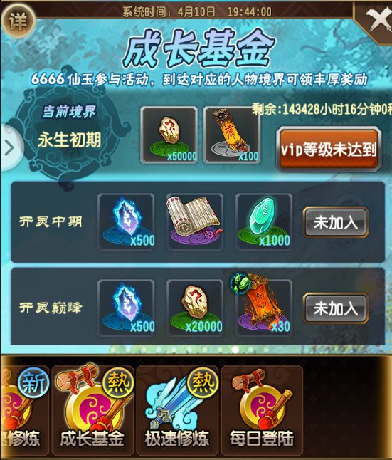 在游戏的活动列表中,可以看到游戏的升级基金,不过需要vip等级达到6级之后(累计充值100)才能购买,这里建议各位玩家量力而行,如果有一定的能力,这边还是建议把基金买下来的,毕竟送的东西确实不错。