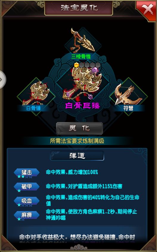 之后是白骨巨锤,之前让你们升级的白骨锤,这里就派上用途了,白骨巨锤谁需要白骨锤、三棱骨锥和符弩进行合成,之后还需要白骨锤碎片、三棱骨锥碎片、符弩碎片和法宝精华进行升级。