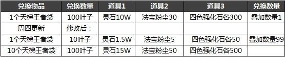 新增紫色附带、金色福袋、天梯王者袋、陨金之精、九月子母剑残片、赤凰残片。(天梯王者袋包含10万灵石、30法宝粉尘、四色强化石各300以一个新玩家的角度来说、奖励很丰富,但是拿起来就比较有难度了,基本上不卡阶段很难打的过大佬。