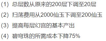 这部分其实也是改动比较大的一部分,最近几天在群里看的比较多的就是讨论这个部分的改动,主要矛盾集中在奖励上,虽然整体难度降低了、兑换成本下降,耗时降低,但同样的降低了可以获得的奖励,从我最近了解到的情况来看,旧版本中幻宫可以说是代练和外挂的重灾区,官方有意整顿,但可能是游戏本身过于古老,很多整改方式不能派上用场,所以选择了比较稳妥的“一刀切”,将幻宫产出大幅度降低。