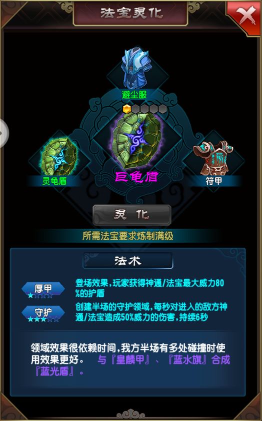 最后则是巨龟盾,需要灵龟盾、避尘服、符甲进行合成,合成之后也需要相应的碎片和法宝精华进行炼制,灵龟盾的副本获取在道玄期,避尘服的获取难度也不小,但这些都可以从开灵巅峰的青铜箱子中把碎片开出来,只是进度会稍微慢一点。