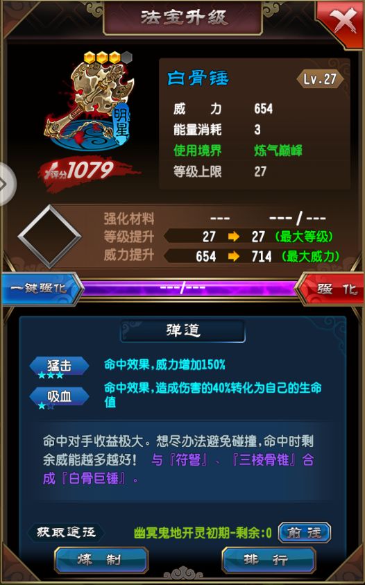 前期获得的材料,尽可能的强化白骨锤,它可以合成白骨巨锤,也是偷袭的一个好法宝。碰到难打的boss的时候,可以选择带控元功,增加一点血量,方便丢法宝破敌。