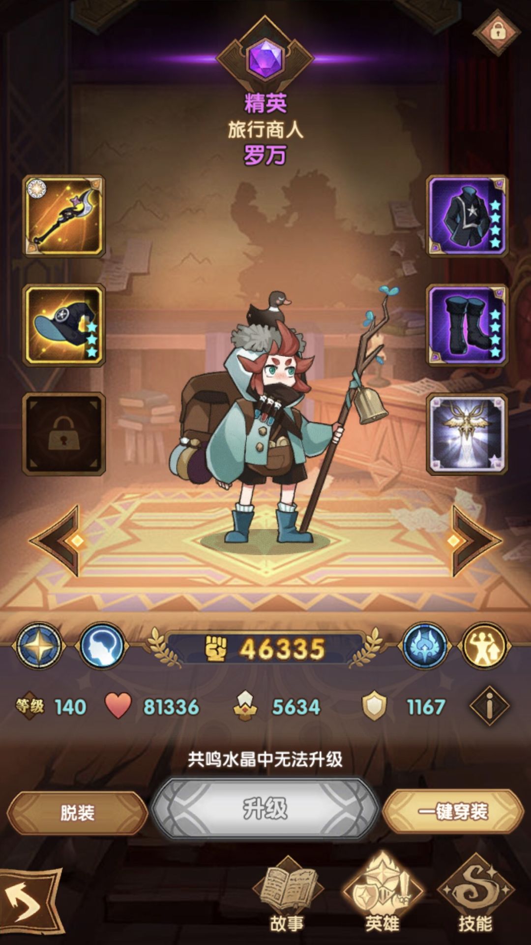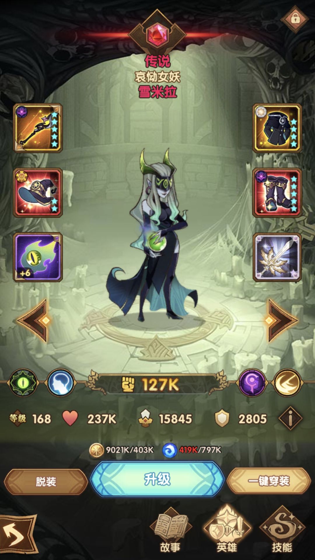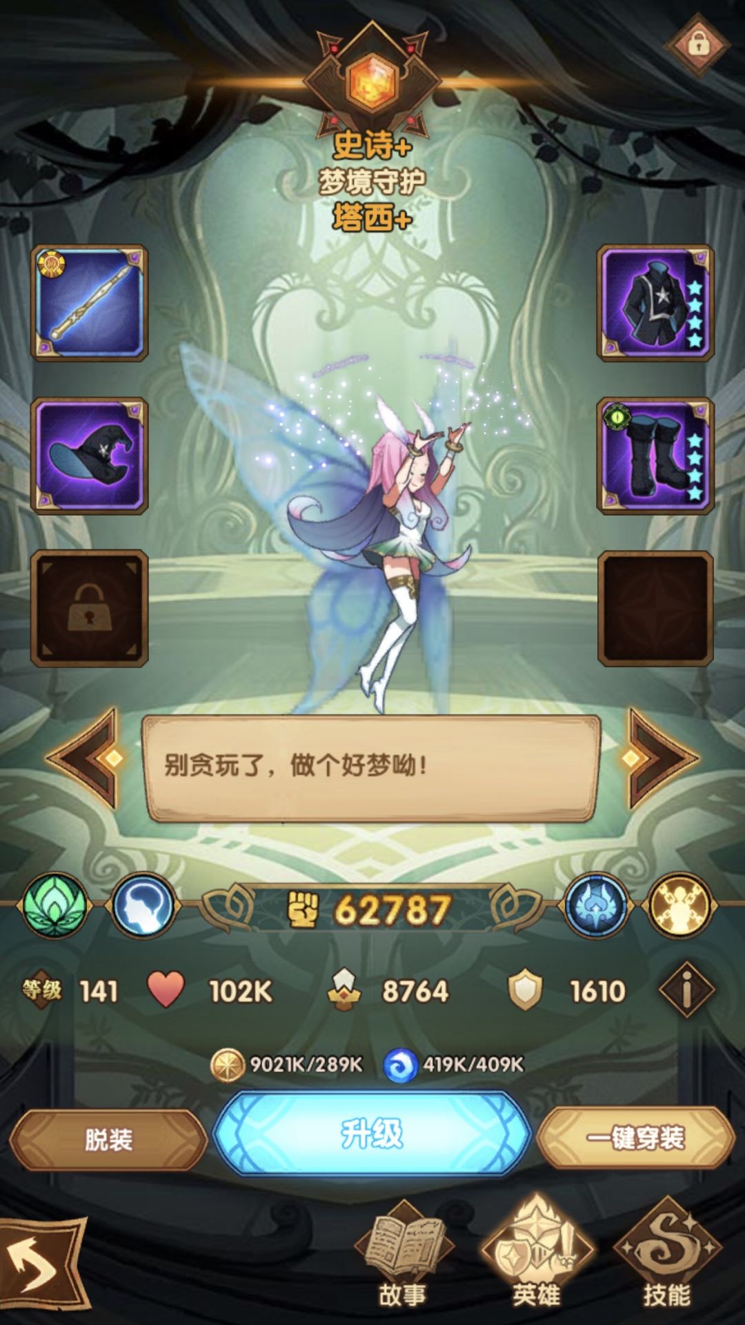 4.零氪靠运气,确实是这样的。要靠运气刷出好的遗物,通关是忘记截图遗物了。但总的来说,拿加攻击,加暴击,加暴击伤害为主,其次是加速。因为我能确保每一个精英怪前我的女妖,女仆,蝴蝶都是满能量的,所以防御其实并不那么重要,全靠女妖秒,攻击力足够高就行。如果女妖有红武器,我相信会容易很多,因为我没有红武,所以感觉挺极限的。