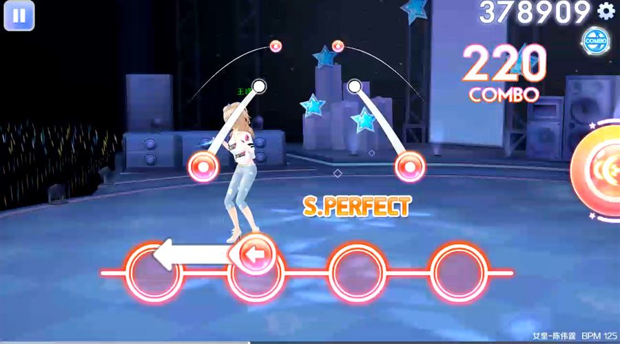 《女皇》这首歌虽然难度达到了6星,不过在星动模式6星难度中,节奏音符的难度相对一般,主要是其中没有密集的长按滑动音符。歌曲开头部分以变轨音符开场,随后在滑动音符、长按音符中间,也会穿插大量的变轨普通音符,由于这是一首快歌BPM速度比较快,所以容易出现单个音符的MISS。首次挑战歌曲,推荐玩家选择得分提高、极限增强两个技能,如果想要达成成就任务的话,那么免除MISS就是非常不错的选择。